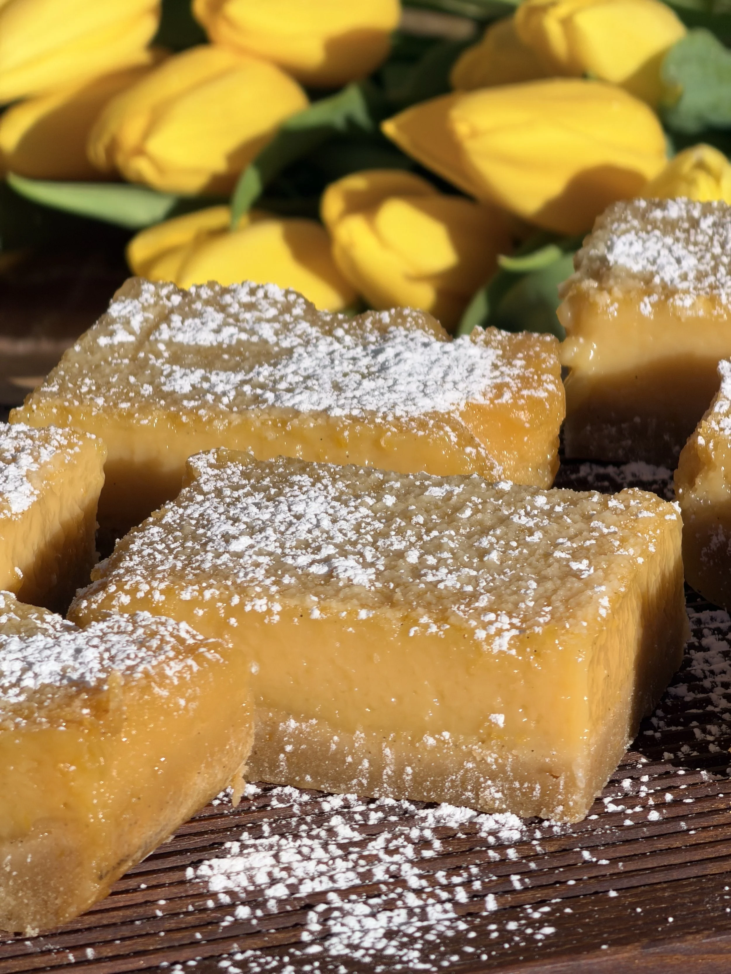 A bright, buttery lemon dairy-free custard set over a tender gluten-free shortbread crust.